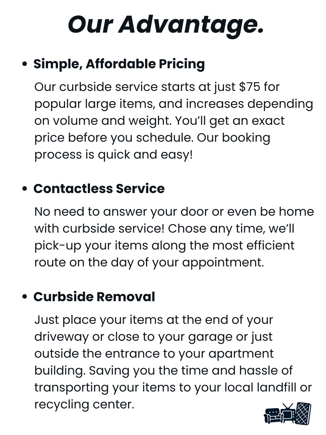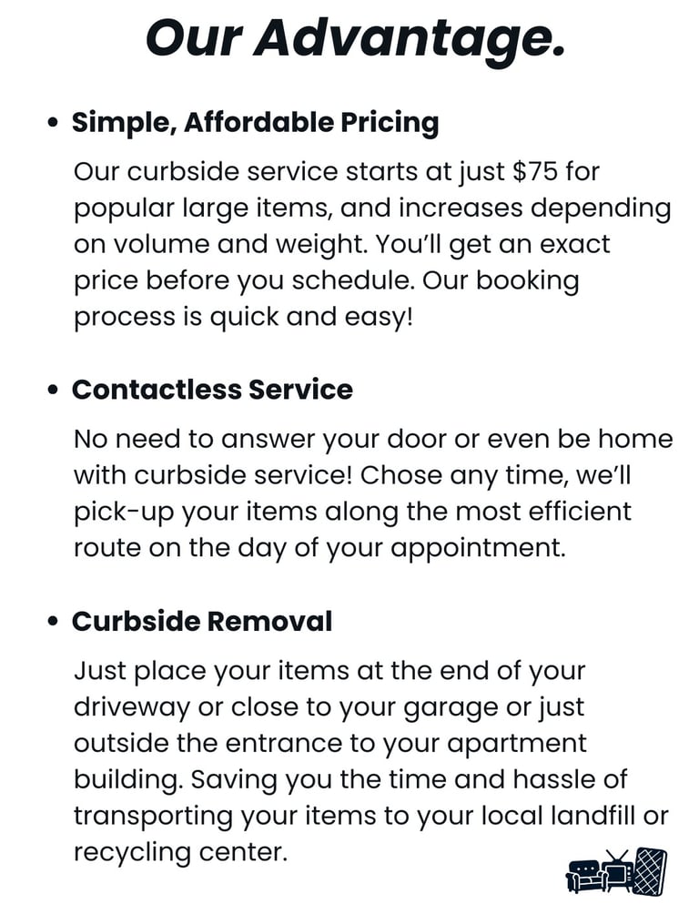 Booking is easy! Use the “Book Online” button on our site to schedule, we use ZenBooker to complete your order. Select your pickup size, Select your pickup date, pay online. Place your items curbside by 8:00 AM on your scheduled day, and we’ll pick up between 8:00 AM and 4:30 PM(along the most efficient route). We'll send a confirmation email with details.